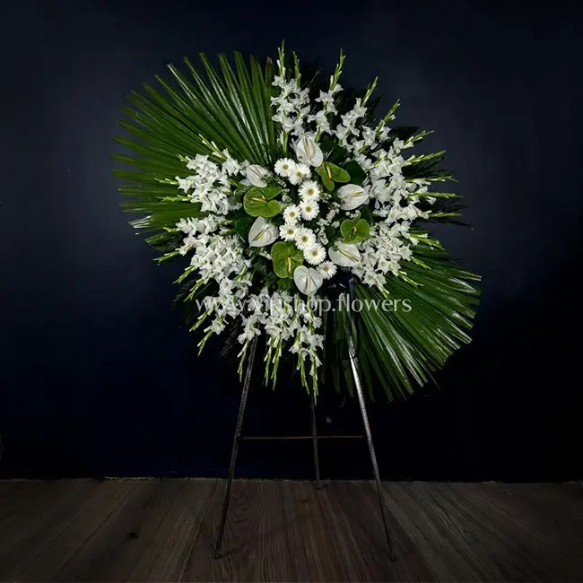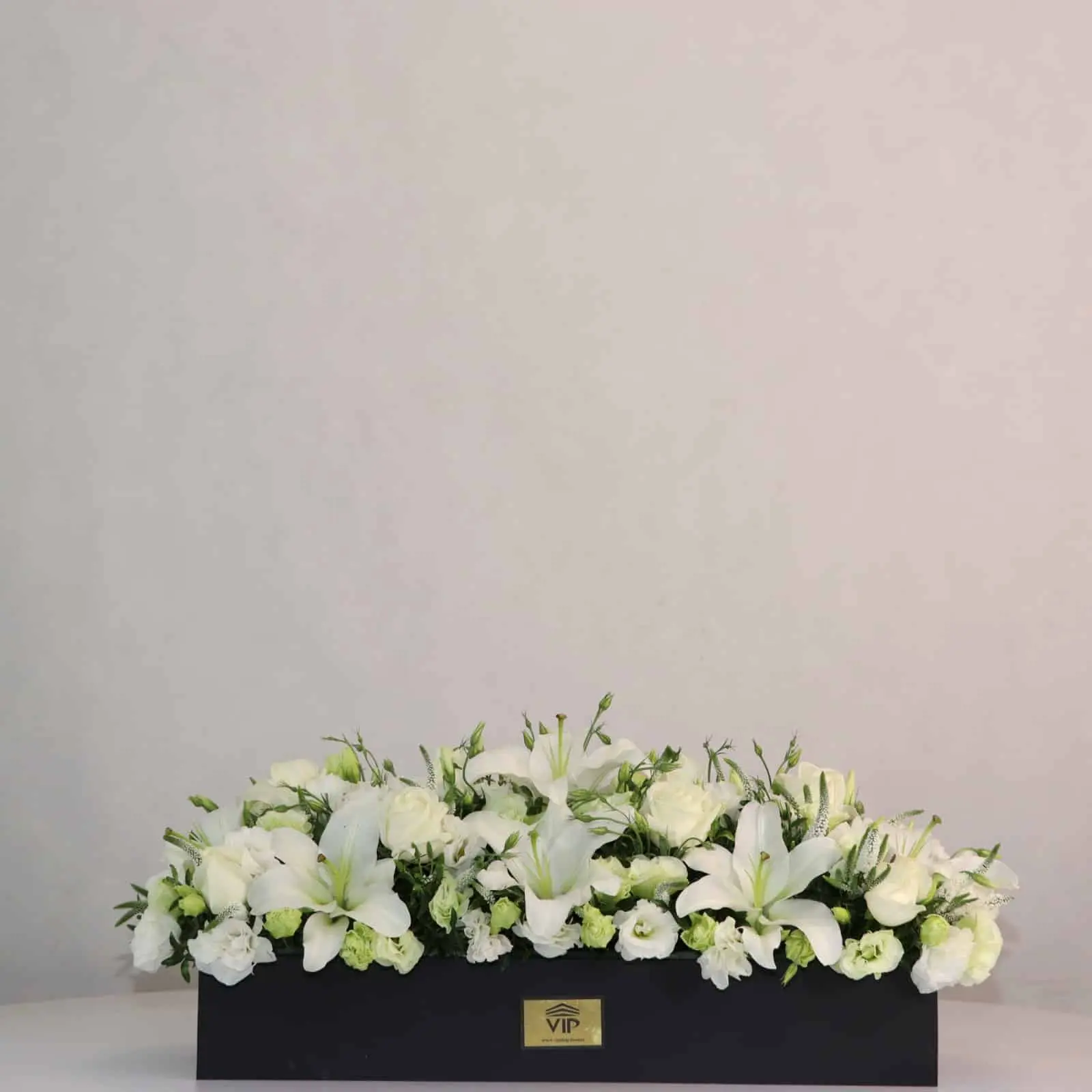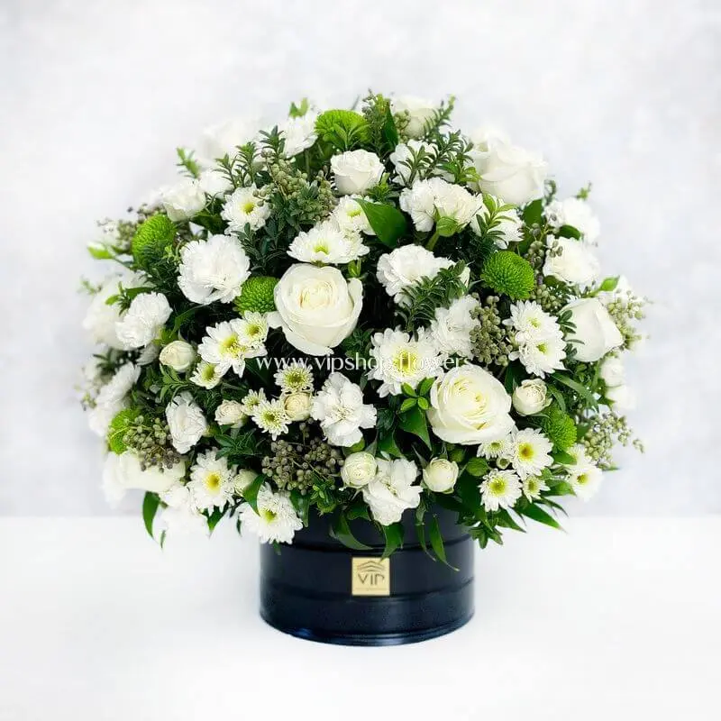 سبد گل تسلیت آرامش ابدی (ترکیب لیلیوم، رز و لیسینتوس)